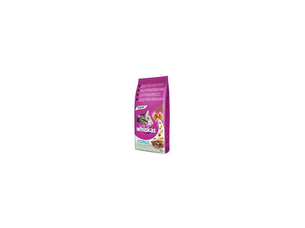 Je kompletná,dokonale vyvážená potrava s kuracím mäsom pre kastrované mačky. Sterilizované alebo kastrované mačky môžubyť náchylnejšie k ochoreniam močového ústrojenstva. Krmivo Whiskas steril je starostlivo pripravené z kvalitných surovín, ktoré nielen výborne chutia, ale zároveň sú špeciálne vybrané tak, aby spĺňali požiadavky na výživu kastrovaných,alebo sterilizovaných mačiek. Zloženie: obilniny, mäso a výrobky živočíšneho pôvodu (min.4% kuracieho mäsa vo svetle hnedých granulách,4% pečene v náplni vankúšikov), bielkovinové extrakty rastlinného pôvodu, oleje a tuky (0,1% slnečnicového oleja), vedľajšie výrobky rastlinného pôvodu(min. 0,5%extraktu z čakanky, min. 0,3% yucca schidigera), minerálne látky, zelenina (min. 4% mrkvy v oranžových granuliach,min.4% hrášku v zelených granuliach). Deklarované akostné znaky:proteíny 32%, tuky 11%, anorgatickélátky8%, vláknina 1,5%, vápnik 1,1%, fosfor 1%, taurín 1100mg/kg.