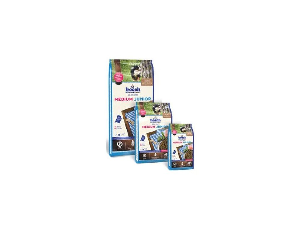 Bosch Dog Junior Medium je krmivo pre šteňatá a rastúce psy stredne veľkých rás (15 - 25 kg), vo forme chutných granúl. Jedná sa o vyvážené, výživné krmivo so zníženým obsahom energie. Toto vyvážené, veľmi výživné a zdravé krmivo má znížený obsah energie preto, aby zaistilo šteňatám rovnomerný, ale nie príliš rýchly rast. Bosch Junior Medium berie ohľad na špecifiká vývoja psov stredne veľkých plemien (väčší rast za deň ako u menších psov, hlavná fáza rastu končí neskôr). Organické väzby zinku (cheláty zinku) sú v tele lepšie využívané. Vďaka tomu má metabolizmus psa k dispozícii viac zinku. Zinok je dôležitý pre zdravú, pružnú kožu a lesklú srsť. Vyvážený pomer esenciálnych mastných kyselín, ktoré dodávajú celkovú vitalitu, pružnosť kožu a lesk srsti a hlavne podporujú prirodzenú obranyschopnosť. Vyvážený obsah rôznych rozpustných druhov vláknin (tiež frukto oligosacharidy) stimulujú zdravú črevnú flóru psa a napomáhajú rovnomernému tráveniu. Vďaka vybraným surovinám, spracovaným veľmi šetrne v jednom z najmodernejších podnikov v Európe, dosiahne nadpriemerné stráviteľnosti krmiva. Toto krmivo prispieva k dobrému formovaniu trusu. Vitamín E, vitamín C a stopový prvok selén sú dôležité antioxidanty bunkových jadier, ktoré chránia pred škodlivými zásahmi odpadových produktov látkovej výmeny. Špeciálny extrakt z mušlí s vysokým obsahom glukosamínu a chondroitín sulfátu podporujú výstavbu a správnu funkciu chrupaviek , najmä v oblasti kĺbov. V krmive pre psov Bosch sú použité iba starostlivo vybrané suroviny a prísady (napr. hydina, celé vajcia, hovädzie, jahňacie, rôzne druhy zeleniny, celozrnné obilniny). Tieto suroviny boli šetrným výrobným procesom spracované vo veľmi chutné, optimálne zužitkovateľné, zdravé a kvalitné krmivo. Zložky živočíšneho pôvodu pochádzajú z mäsa zvierat určených pre spotrebu človekom. K ochrane životne dôležitých, ale veľmi citlivých vitamínov a esenciálnych mastných kyselín v krmive Bosch bola použitá zmes rôznych tokoferolov prírodného pôvodu. V krmive Bosch nie sú použité žiadne umelé dochucovadlá. Vďaka šetrnému vysúšaniu majú granuly Bosch dlhú trvanlivosť aj bez konzervačných látok. Ak kŕmite svojho psa kvalitnými granulami Bosch, môžete mať ako majiteľ dobrý pocit, že dávate Vášmu psovi správne krmivo. Krmivo Bosch sa naviac vyznačuje veľmi priaznivým pomerom kvality k cene.
