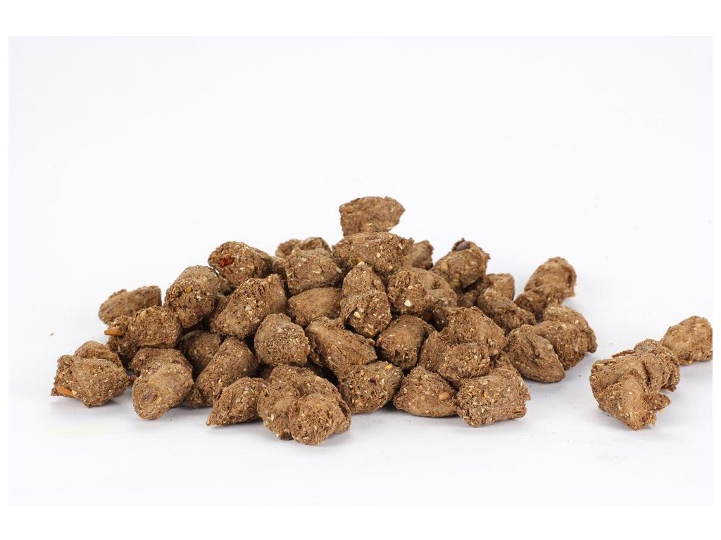 Krmivo obsahuje: Tri druhy živočíšnych múčok, kukuricu, pšenicu, hrach, pohánku, kŕmne kvasnice, srvátku, ovocnú dreň, glukózu, rastlinný olej, a i.
