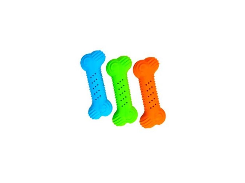 Hračka pre Vášho psa. Hračka kosť je vyrobená z pevnej gumy, pri zakúsnutí vydáva praskavý zvuk. Dodáva sa v mixu troch atraktivnych farieb (modrá, oranžová a zelená) Rozmer: 55 x 35 x 140 mm.