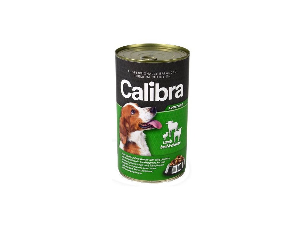 Kompletné krmivo pre dospelých psov s kúskami jahňacieho, kuracieho a hovädzieho mäsa v želé. Konzervy Calibra obsahujú dôležité vitamíny, minerály a inulin, ktorý má prebiotické účinky. Naopak v nich nie je zastúpená žiadna sója, geneticky modifikované suroviny, umelé farbivá ani chemické konzervanty. Zloženie: mäso a výrobky živočíšneho pôvodu (z toho 5% jahňacie, 5% kuracie, 5% hovädzie), obilniny, bielkovinové extrakty rastlinného pôvodu, minerálne látky, vedľajšie výrobky rastlinného pôvodu (0,2% inulin), cukry.