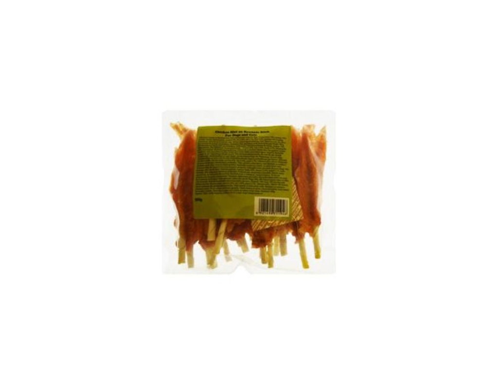Krehké kuracie filety sušené na bielej byvolej tyčke cca 18cm. Pre psov. Zloženie: kuracie prsné filety 70%, byvolej kože 30%
