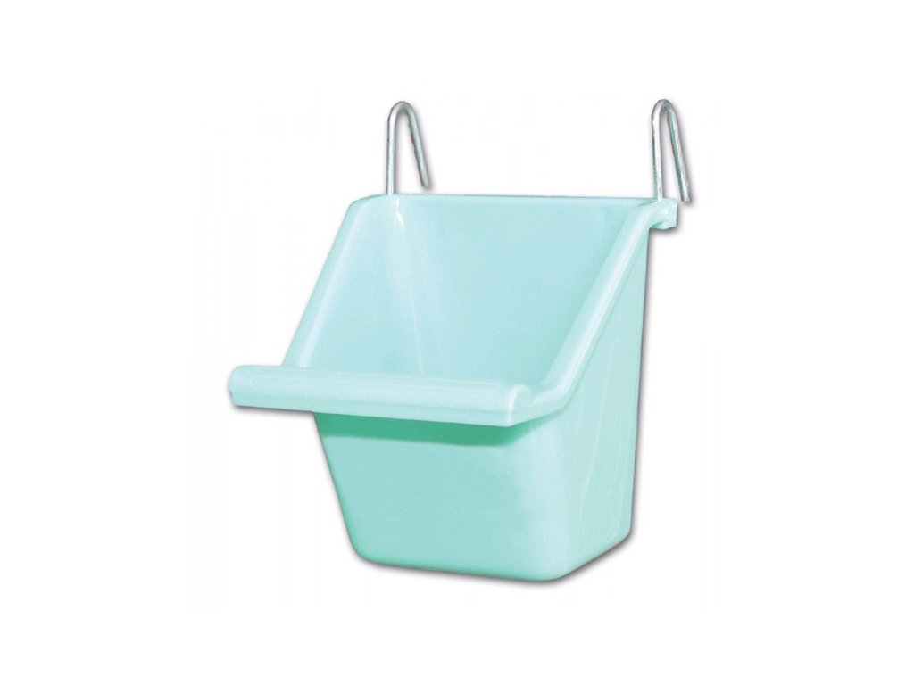 Plastové krmítko k zaveseniu do klietky pomocou dvoch kovových háčkov.