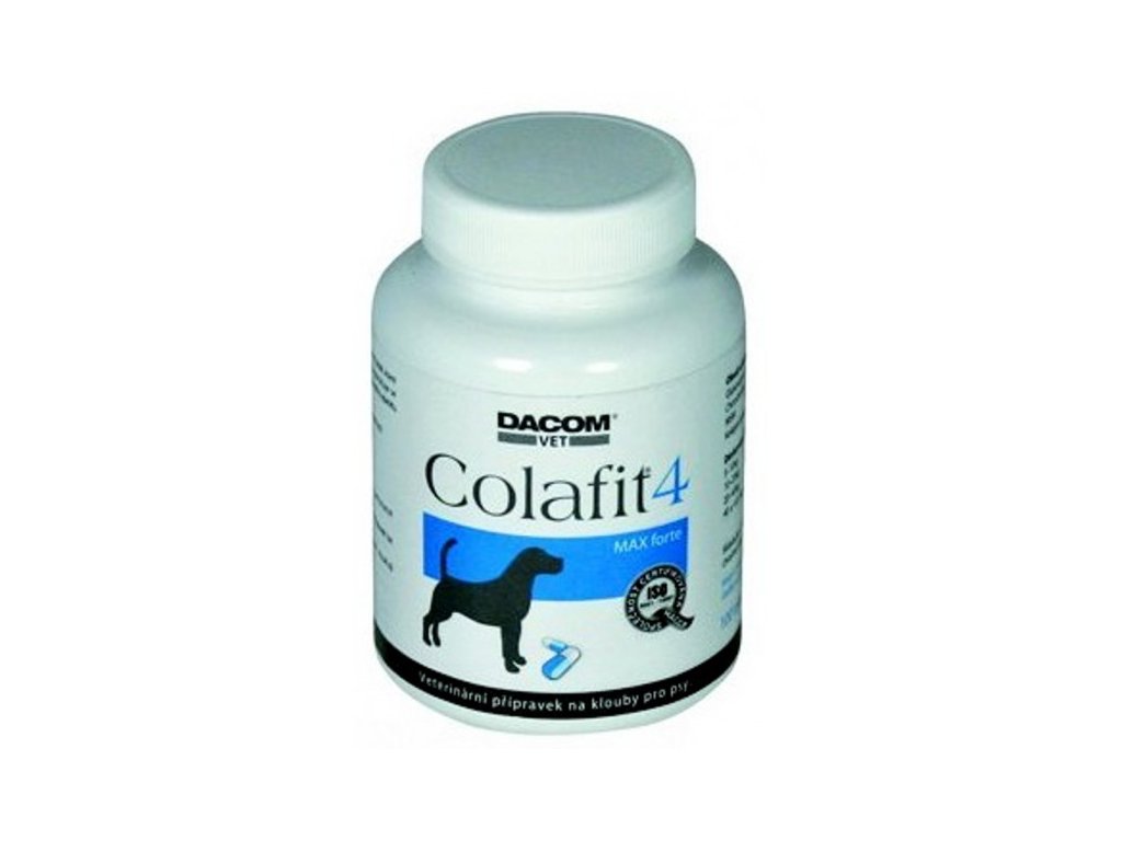 Colafit 4 Max Forte je kĺbna výživa pre psov, podávanie Colafit 4 Max Forte zlepší pohyblivosť kĺbov a odstráni ich ztuhnutosť. Colafit 4 Max Forte stimuluje správny vývoj a vývin kĺbov, udržuje pevnosť a pružnosť chrupaviek. Má výrazné účinky proti bolesti a zápalom kĺbov. Zloženie Colafit 4 Max Forte: Glukosamin sulfát 300mg, Chondroitin sulfát 100mg, riasy kmeňa chlorela, vitamín B2, Niacin, stopové prvky v anorganickej a chelátovej forme Zn, Cu, vitamín E, vitamín C, selén a schutňujúce látky. Dĺžka a spôsob podávania: pre dosiahnutie požadovaného efektu sa Colafit 4 Max Forte podáva 2– 3 mesiace, dvakrát do roka. Prípravok je možné podávať aj dlhodobo, po konzultácii s vet. lekárom. Veľkosť balenia: 50 a 100 toboliek. Upozornenie: prípravok je možné podávať súčasne s krmivami, ktorá obsahujú chondroprotektívne látky. Spôsob použitia: tobolky sa podávajú každý deň podľa návodu, samostatne, alebo s kúskom potravy. Bezpečnostné opatrenie: pred podávaním prípravku je nutná konzultácia s veterinárnym lekárom.