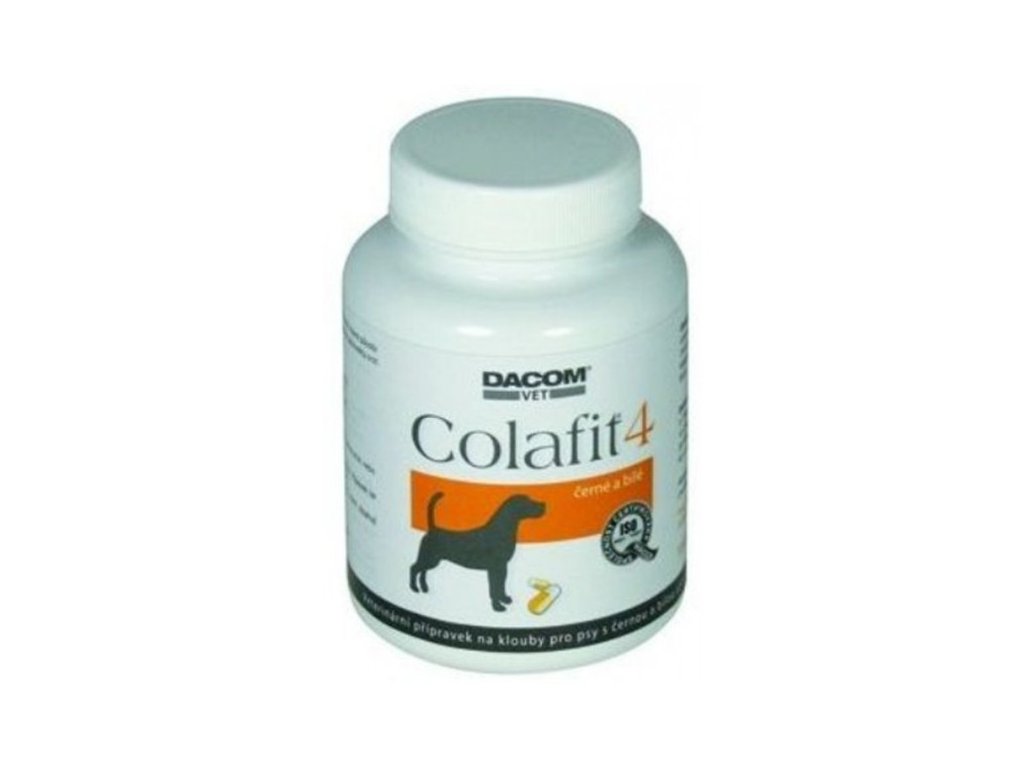 Colafit 4 pre bielych a čiernych psov je kĺbna výživa pre psov, chráni a regeneruje kĺbne chrupavky. Colafit 4 pre bielych a čiernych psov slúži na preventívne ošetrenie kĺbov, zmiernenie bolestivosti kĺbov a zlepšenie ich pohyblivosti, prevenciu artrózy a ďalších kĺbnych problémov, preventívne pôsobí pri liečbe kožných poranení. Biotin zaisťuje kvalitnú a výraznú farbu bielej, alebo čiernej farby pre dané plemeno psa, priaznivo ovplyvňuje kvalitu a hustotu srsti. 0bsah účinných látok v 1 tobolke: Glukosamin sulfát 500 mg, Chondroitin sulfát, 100 mg Kolagen, 1 mg Biotin 600 ug. Ďalšie zložky Colafit 4 pre bielych a čiernych psov: riasy kmeňa chlorela, vitamíny B2, Niacin, stopové prvky v anorganickej a chelátovej forme Zn, Cu, vitamín E, vitamín C, selén a zchutňujúcw látky. Dĺžka a spôsob podávania: pre dosiahnutie požadovaného efektu sa Colafit 4 podáva 2– 3 mesiace, dvakrát do roka. Prípravok je možné podávať aj dlhodobo, po konzultácii s vet. lekárom. Colafit 4 pre bielych a čiernych psov je možné podávať súčasne s krmivami, ktorá obsahujú chondroprotektívnw látky. Veľkosť balenia: 50 toboliek. Spôsob použitia: tobolky sa podávajú každý deň podľa návodu, samostatne, alebo s kúskom potravy. Bezpečnostné opatrenia: pred podávaním prípravku je nutná konzultácia s veterinárnym lekárom.