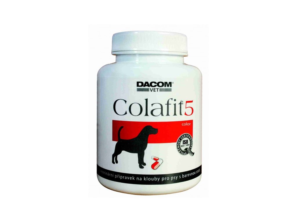 0bsah účinných látok v 1 kapsule: * Glukosamín sulfát 500 mg * Chondroitín sulfát 100 mg * Kolagén 1 mg * Biotín 300 ug * Beta-karotén 200ug Ďalšie zložky: riasy kmeňa chlorella, vitamíny B2, Niacín, stopové prvky v anorganickej a chelátovej forme Zn , Cu, vitamín E, vitamín C, selén a aromatické zlúčeniny. Dĺžka podávania: pre dosiahnutie požadovaného efektu sa Colafit 5 podáva 2- 3 mesiace, dvakrát do roka. Liek je možné podávať aj dlhodobo, po konzultácii s vet. lekárom. Veľkosť balenia: 50 kapsúl Upozornenie: prípravok možno podávať súčasne s krmivami, ktoré obsahujú chondroprotektívne látky. Spôsob použitia: kapsuly sa podávajú každý deň podľa návodu, samostatne, alebo s kúskom potravy. Bezpečnostné opatrenia: pred podávaním prípravku je nutná konzultácia s veterinárnym lekárom. Podmienky skladovania: v temnom a suchom prostredí, chráňte pred deťmi. Dávkovanie: Malé plemeno: (5 - 10 kg) 1 kapsula Stredná plemeno: (10 - 20 kg) 1 až 2 kapsuly Veľké plemeno: (20 - 40 kg) 2 až 4 kapsuly Obrie plemeno: (40 a viac kg) 4 a viac kapsúl