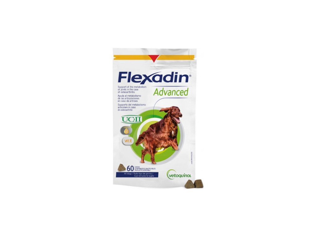 Flexadin Ò Advanced je unikátny výživový doplnok obsahujúci UC-II kolagén (nedenaturovaný kolagén typu II), ktorý má preukázateľný účinok u psov s osteoartritídou, výťažok liečivé rastliny Boswellia serrata, Ktorá je známa pre svoj protizápalový účinok a ďalšie látky podporujúce metabolizmus kĺbov (mastné kyseliny omega 3 a omega 6, vitamín E).