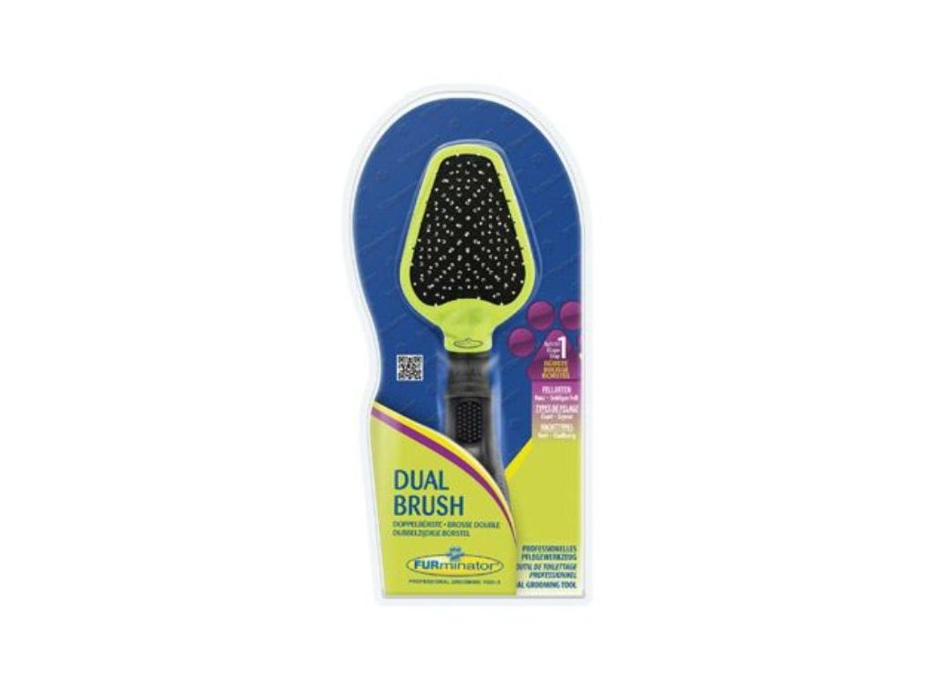 FURminator kefa Dual Brush pre psov - je patentovaná kefa pre rozčesanie srsti, finálnu úpravu a podporu lesku srsti. Drôtená hlavica precízne rozčeše aj silno splstnatenú srsť (vhodné pre krátku i dlhú), prenikne až do podsady. Hlavica s jemnými hustými štetinami srsť upraví, uhladí a dodá lesk. Kefa neťahá a neláme srsť. Vhodné pre takmer všetky plemená psov.