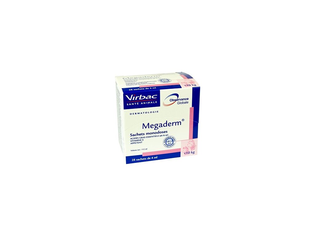 Čo je MEGADERM? MEGADERM je potravinový doplnok s obsahom esenciálnych mastných kyselín (EFAS) patriacich do rodiny omega 6 (6) a omega 3 (3) v optimálnych množstvách a pomeroch (5: 1). MEGADERM pomáha pri tlmení kožných porúch, najmä v prípade alergií. Účinkuje na 2 úrovniach, ktoré sa vzájomne dopĺňajú: 1- pomáha pri obnove integrity kože 2- pomáha pri tlmenie zápalu (červenanie & pruritus) MEGADERM tiež udržuje prirodzené obranné mechanizmy organizmu, čo pomáha k udržaniu dobrého zdravotného stavu zvieraťa.