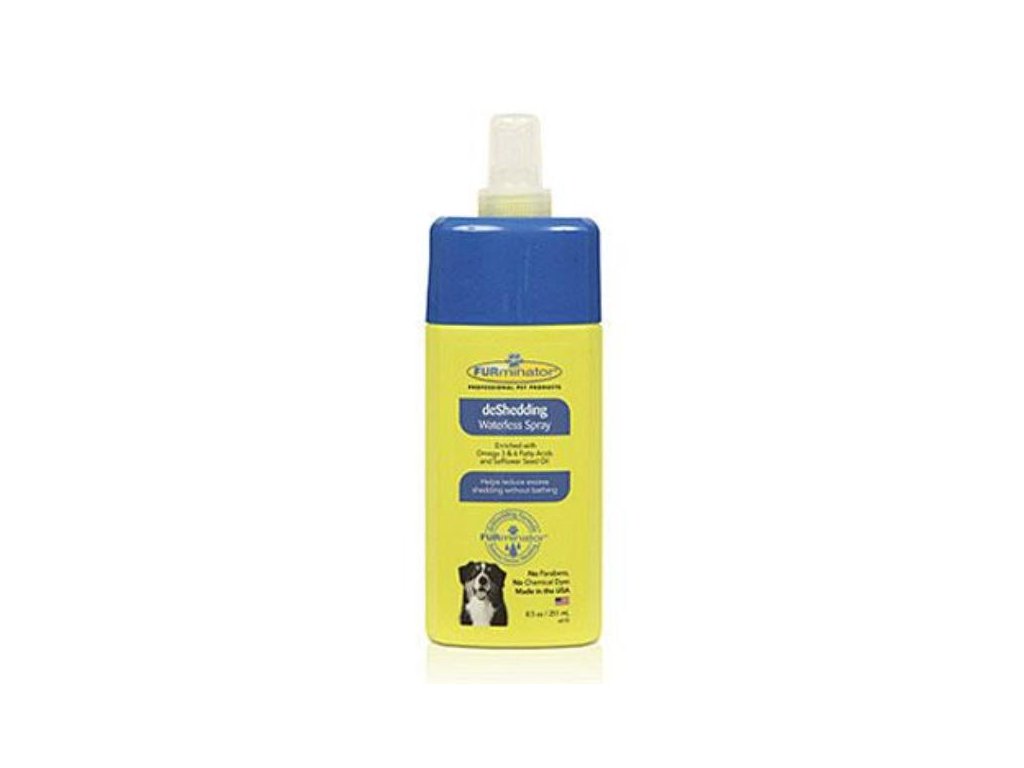 FURminator Proti pĺznutiu suchý spray - funguje ako šampón, ale bez toho, aby ste museli zviera kúpať. Spray pomáha znižovať nadmerné pĺznutie a je vhodný tiež pre zvieratá, ktorá kúpanie nemajú rady. Obsiahnuté prírodné látky tiež pomáhajú rastu novej kvalitnej srsti. Spray je obohatený o omega 3 a 6 mastné kyseliny a olej zo semien svetlice farbiarskej. Vhodné pre psy a kočky od 6-tich týždňov. Výrobok neobsahuje parabény, umelé ani chemické farbivá.