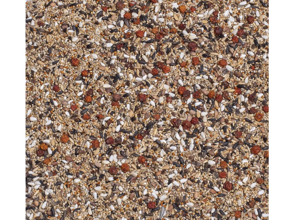 Zloženie: lesknica, biele proso, lúpaný ovos, kardi, žlté proso, červené proso, pohánka, niger, konopné semeno, japonské proso, nelúpaná ryža, žltý mohár, malá čierna slnečnica, ostropestrec mariánsky, biela perila, ľanové semeno, semeno borovice Aleppo, plody jarabiny.