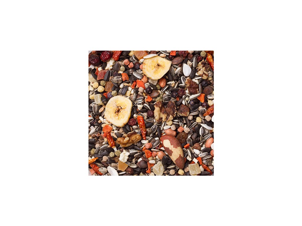 Zloženie: čierna slnečnica, pásikavá slnečnica, kardi, pohánka, biely cirok, extrudované granule, paddy ryža, pšenica, cédrové orechy, lúpaný ovos, grit, plody jalovca, jačmeň, sušené hrozienka, konopné semeno, sušené šípky, sušená mrkva, lúpané arašídy, tekvicové semienka, ostropestrec mariánsky, para orechy, sušené ovocie (papaya, ananás, banán, jablko), vlašské orechy, plody sušenej jarabiny, čili papričky.